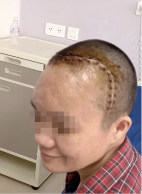 Trường hợp của nữ bệnh nhân sau được phẫu thuật ghép vá hộp sọ bằng vật liệu PEEK theo công nghệ in 3D của Công ty Cổ phần Y Sinh Ngọc Bảo, do đội ngũ y bác sĩ của Bệnh viện 108 thực hiện.